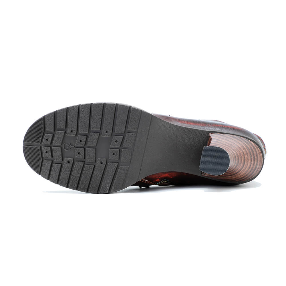 This handcrafted distressed leather high-heeled ankle boot showcases a unique color effect. The exquisite craftsmanship creates a blend of red and black colors on the leather as if an artist has carefully left traces on the material. The high-heel design adds elegance and confidence to your stride, allowing you to exude charm in any setting. These ankle boots are not just shoes; they are also artistic creations that complement a variety of fashionable looks, enhancing your overall image. Whether walking on the street or attending social events, they are sure to capture your attention and make you stand out.
