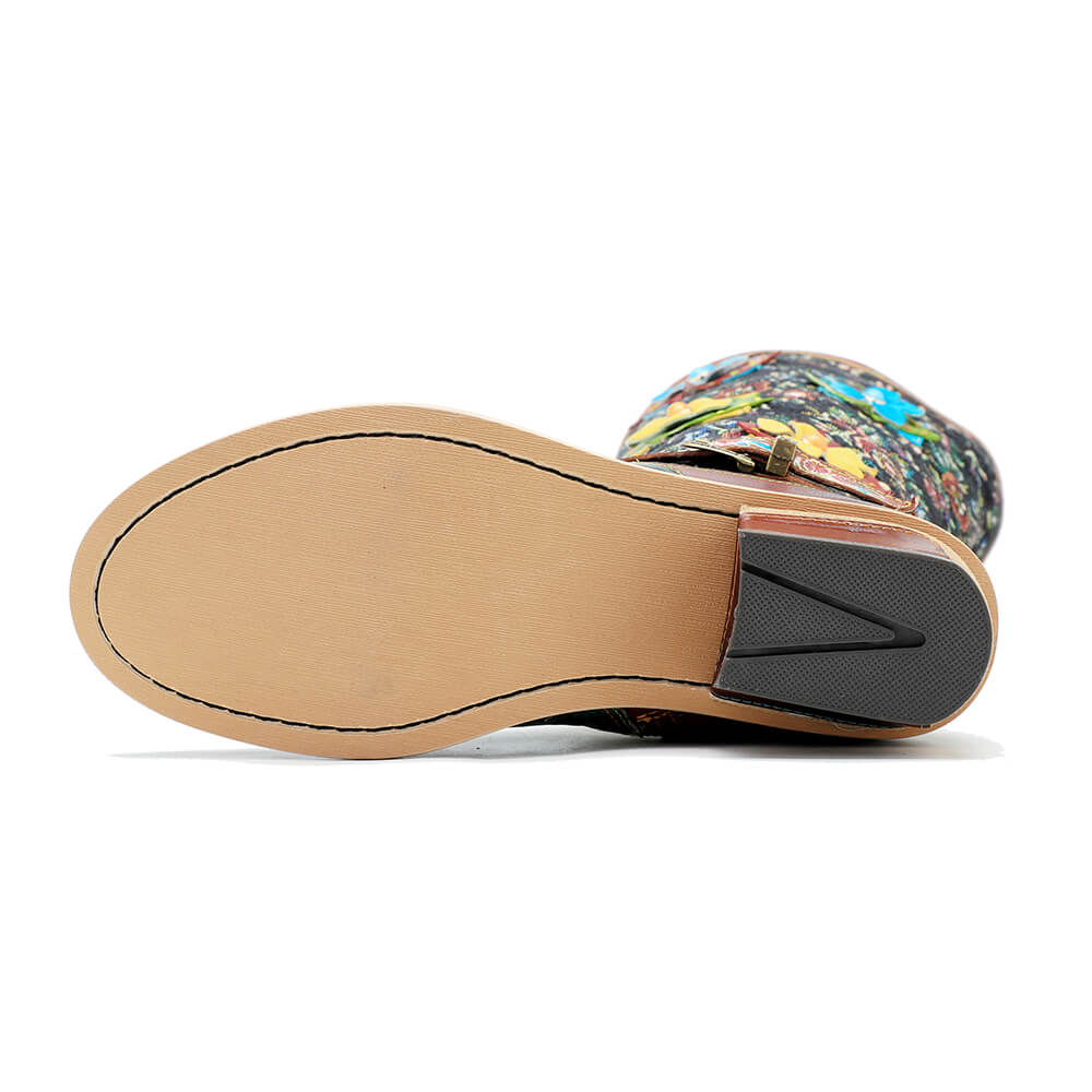 Black base with green accents, French style multi-colored floral tapestry tubes, hand-painted leather-trimmed front adjustable lace-up boots, and a coordinating wood-colored heel.