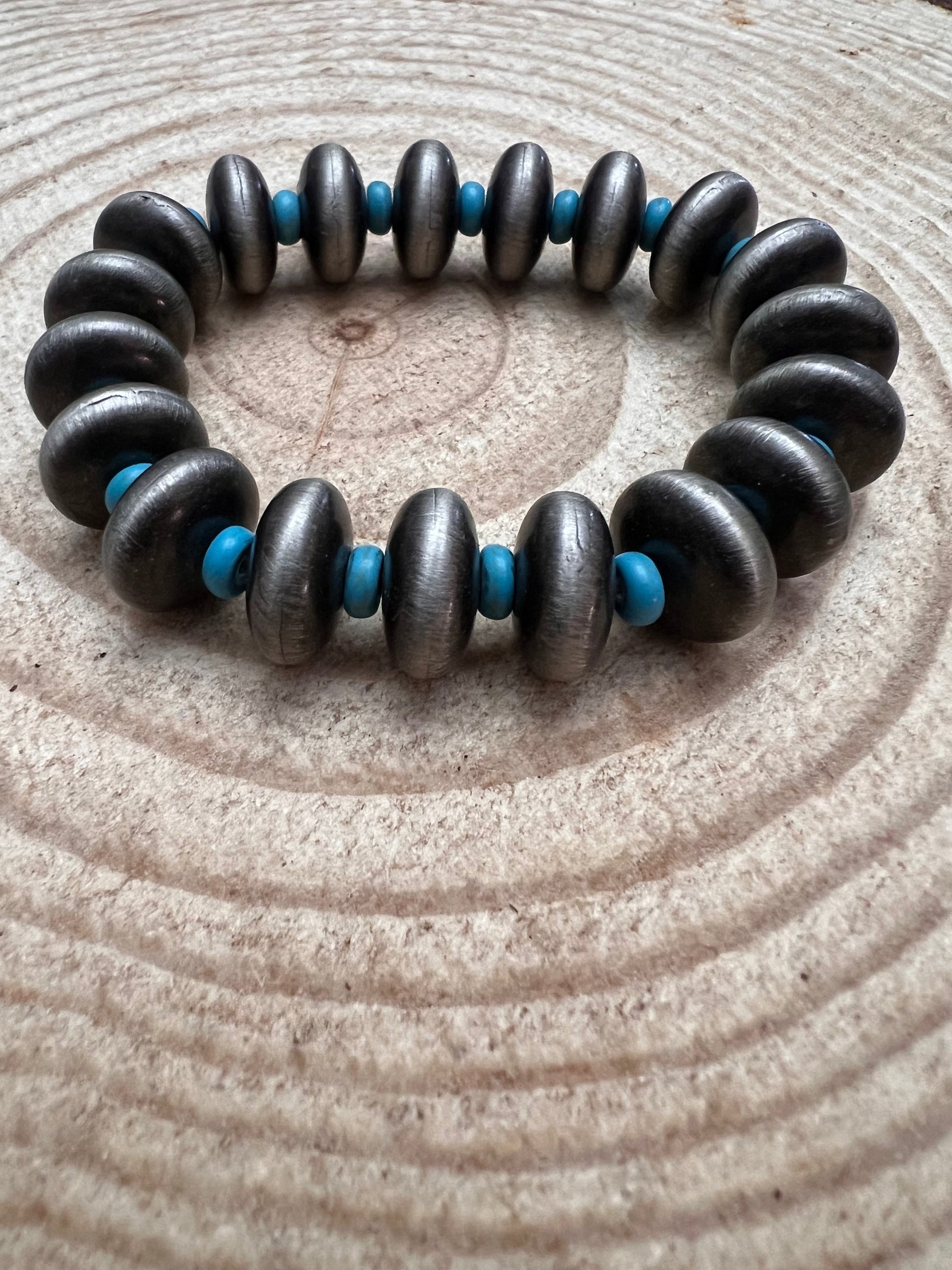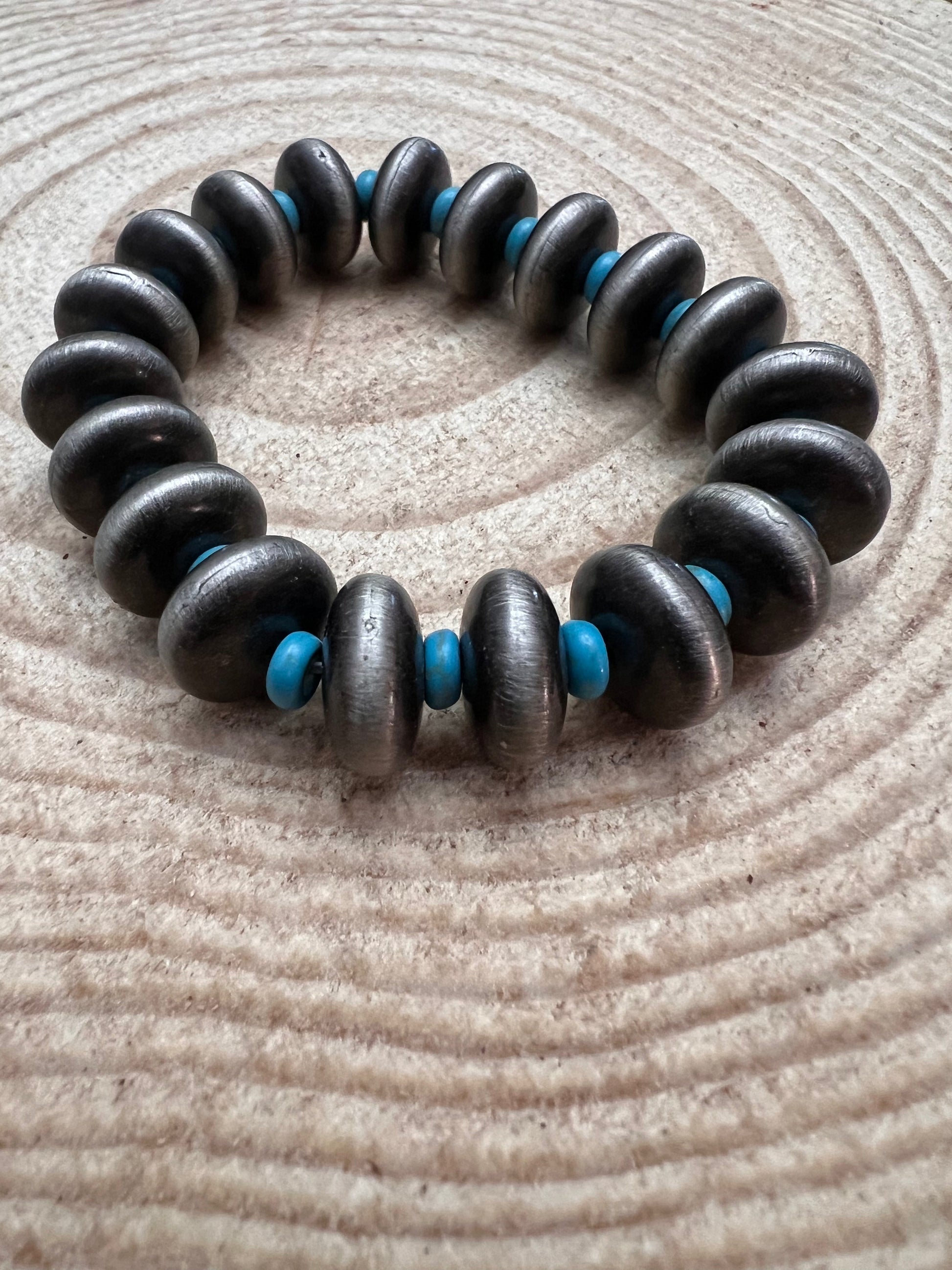 Western Faux Saucer Pearl Stretch Bracelet with Faux Turquoise - 6 1/2 inch