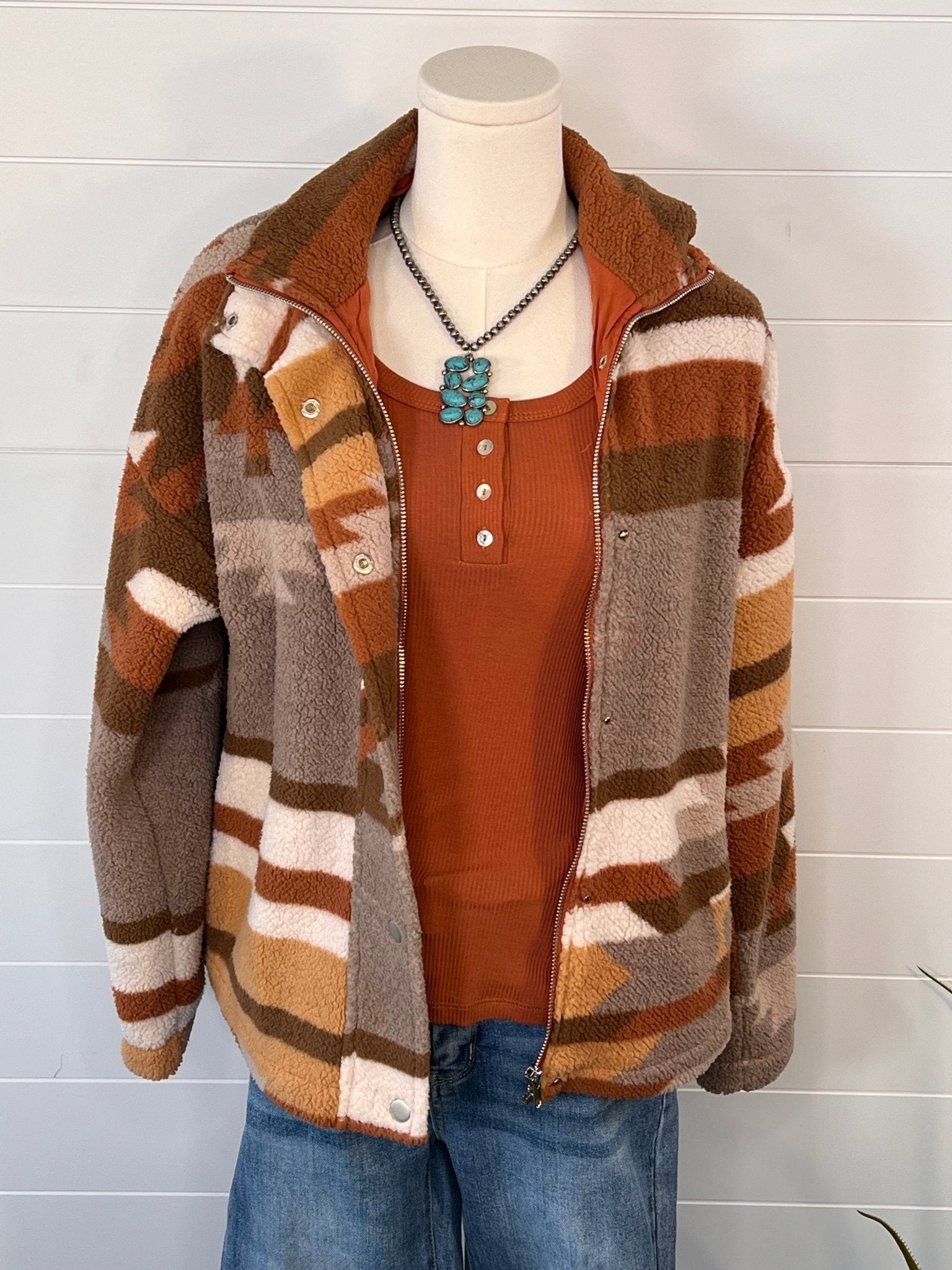 This necklace features a Western Geometric Stone Pendant, paired with a Faux Pearl Necklace in Burnished Silver and Turquoise Color. The pendant hangs on an 18" chain with a 3" extension, and the pendant itself measures 2".