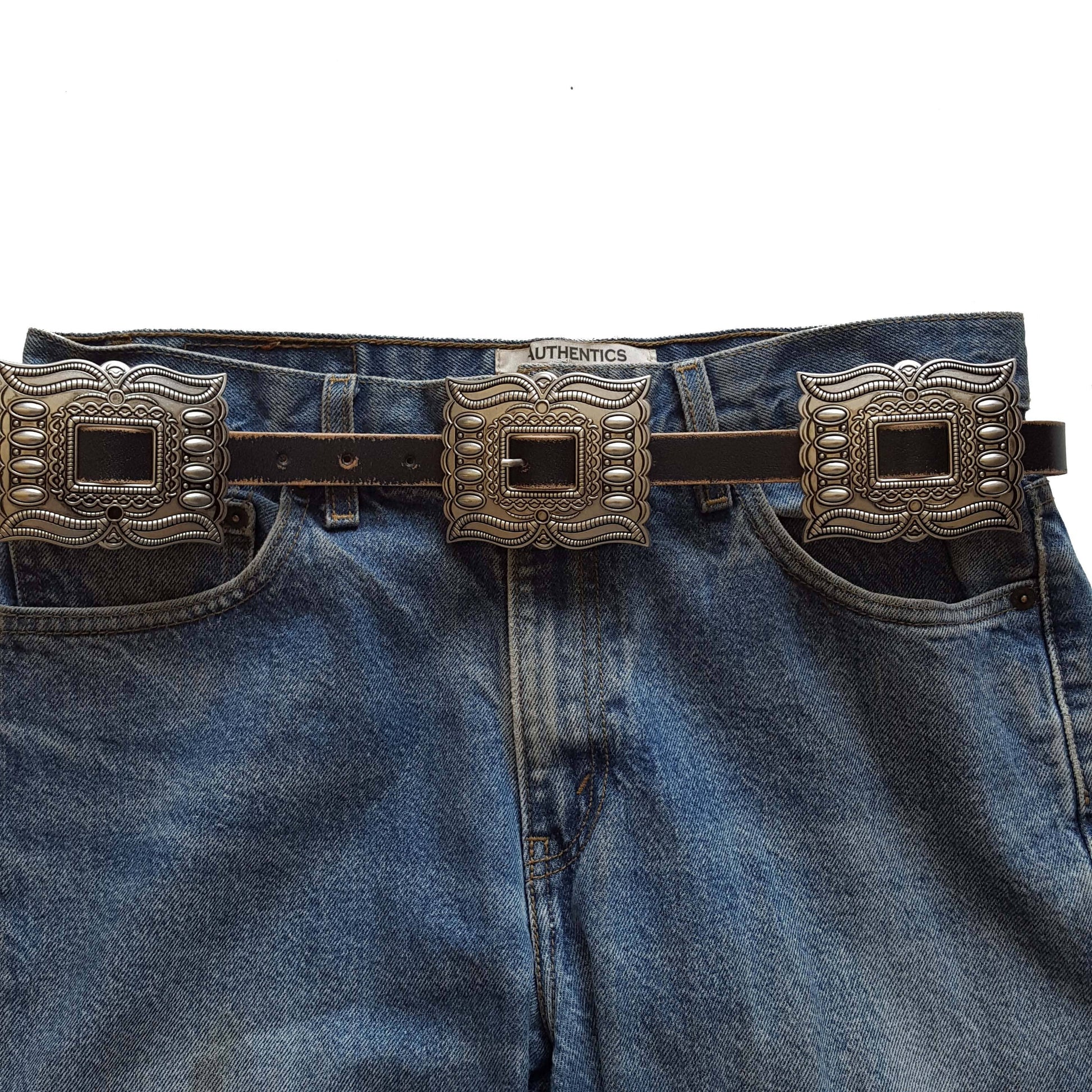 Western Silver Rectangular Concho Leather Belt - Brown or Black