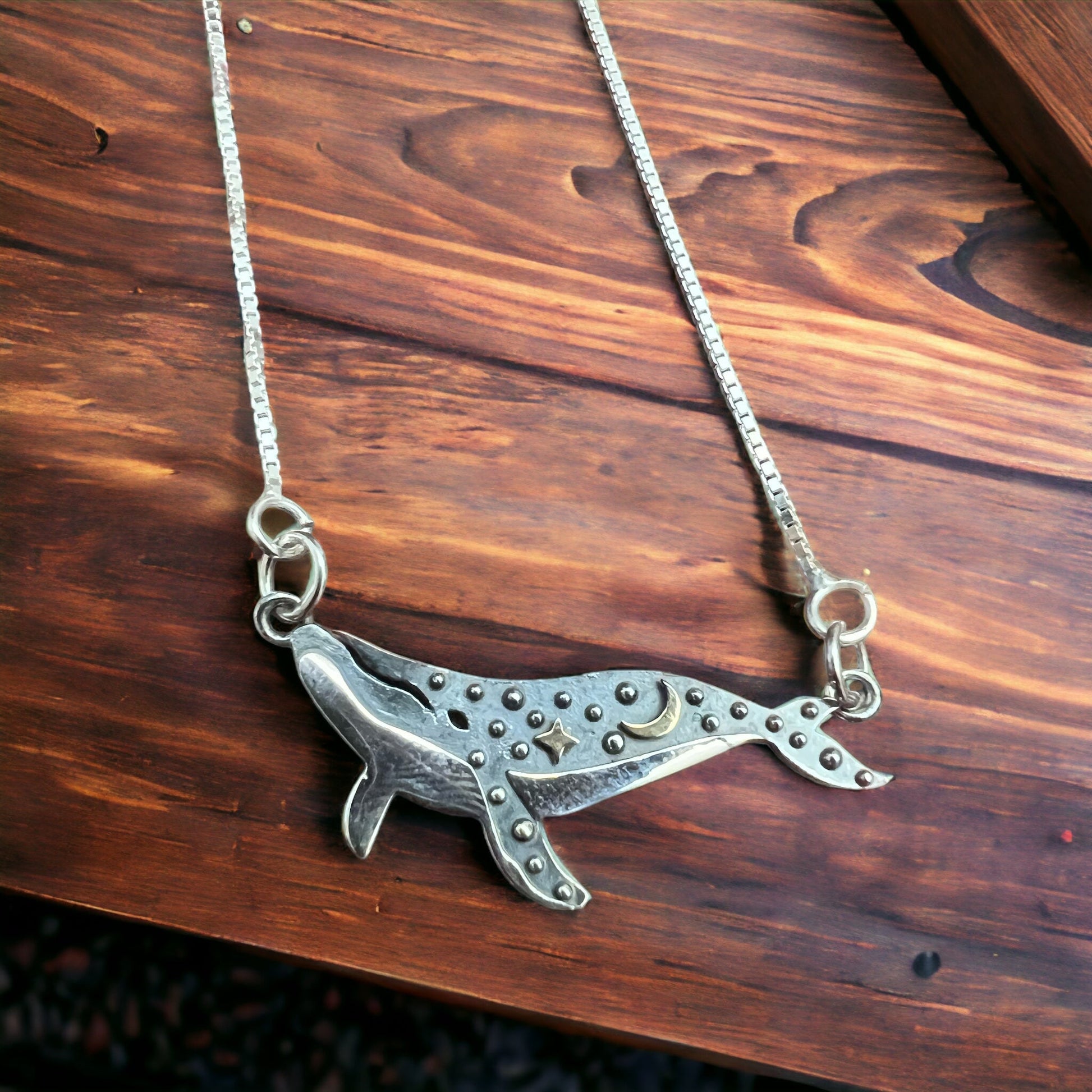 Whale Festoon Necklace on 18 inch sterling silver festoon box chain. Make a lasting impression when you wear this sophisticated necklace. Crafted with sterling silver, this piece adds elegance to any outfit.